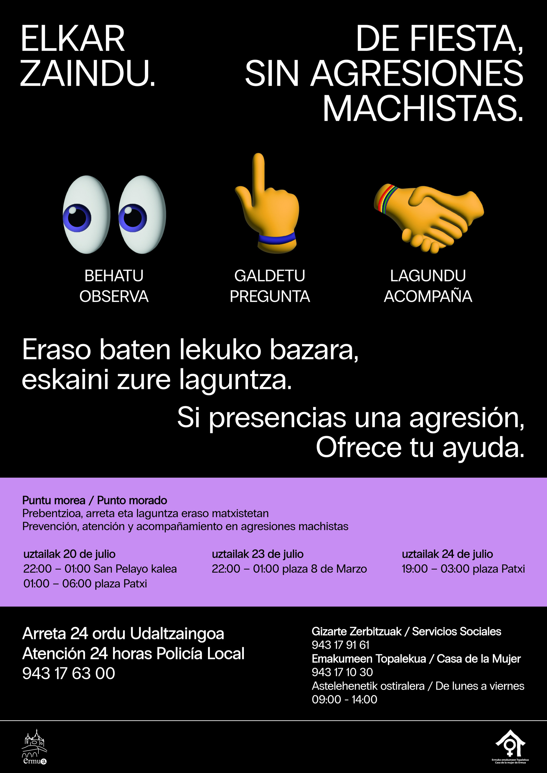 Ekimenaren izenburua Elkar zaindu. Jaietan, eraso matxistarik gabe da, eta herritar guztiei behatzeko, galdetzeko eta laguntzeko beharra helarazi nahi die, jarraitu beharreko pausoak emotikono oso berezien bidez adieraziz.