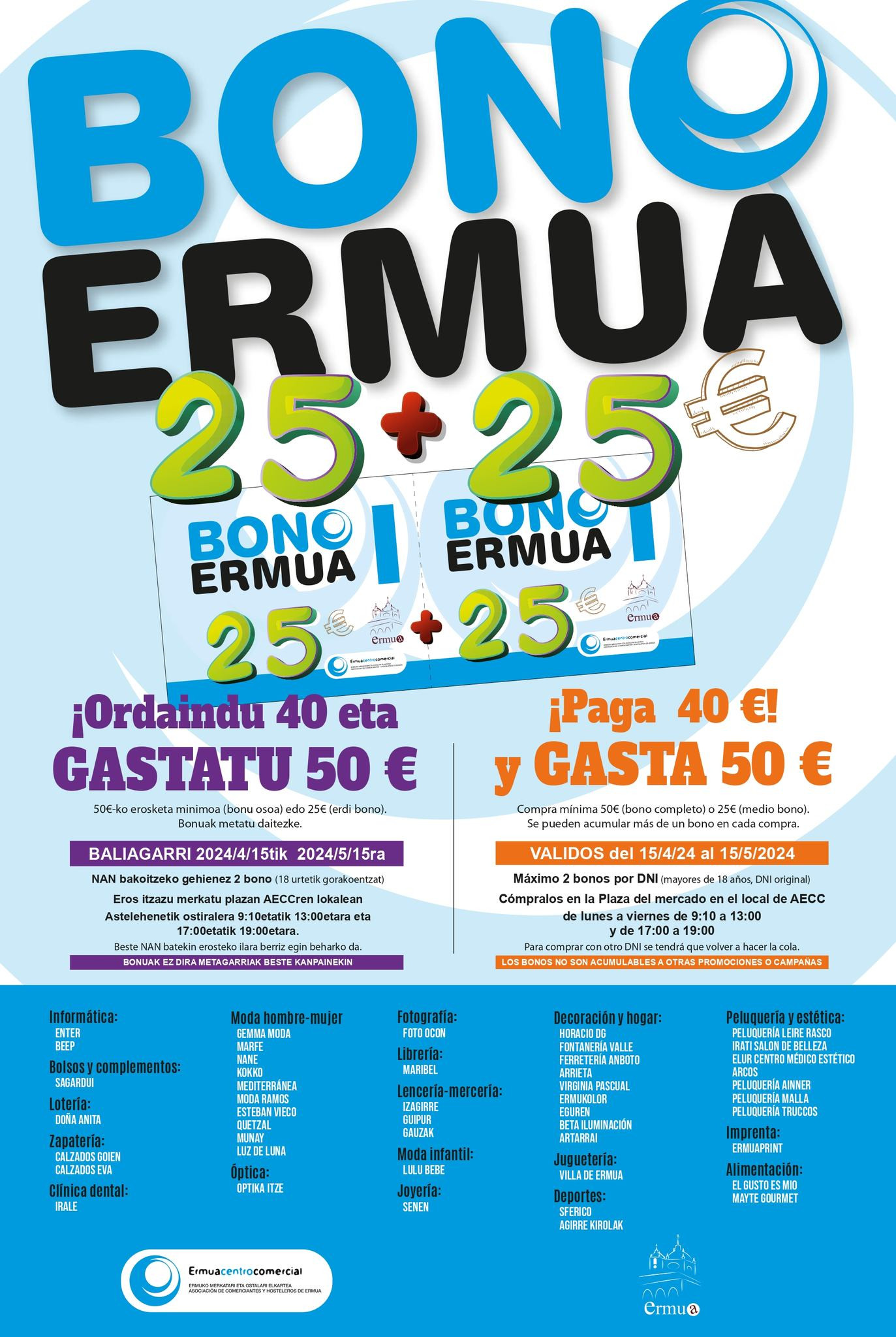 Ermuko Merkatari eta Ostalarien Elkarteak (EMOEk) pizgarri daramaten bonu kanpaina berri bati hasiera eman dio gaur, herriko dendetan merkeago erosteko. "BonoErmua udaberria" goiburuarekin apirilaren 15etik maiatzaren 15era arte produktuak erosi ahal izango ditugu herriko dendetan, 50 eurora arte gastatuz erosleak 40€ ordainduko dituelarik. Gutxienez 50 euroko (bonu osoa) edo 25 €uro (bonu erdia) erosketa egin beharko da. Bonuak ez dira beste sustapen batzuekin bateragarriak. Bono bakoitzak 10€ko hobaria du. Elkarteak bere sare sozialetan ematen du sustapen-kanpainaren berri.