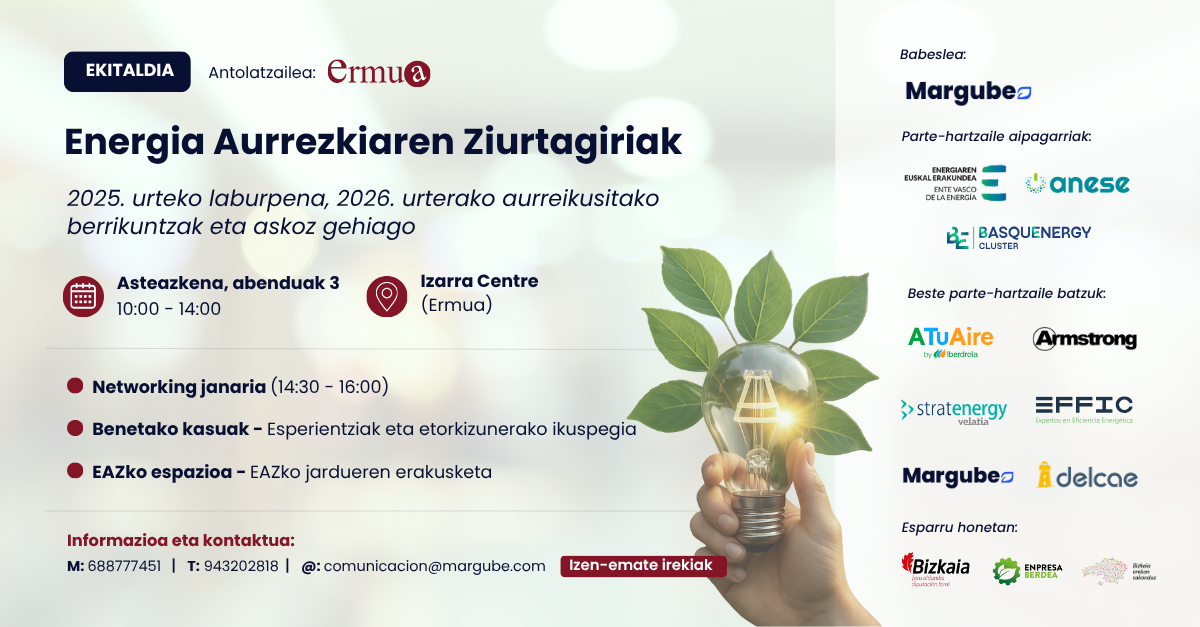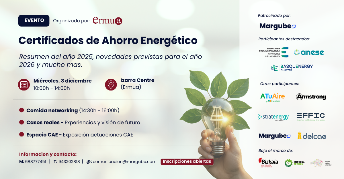 Energia Aurrezteko Ziurtagiriek (EAE) ardatz eta mami izango dira abenduaren 3an -asteazkenean- Ermuko Izarra Centre eraikinean egingo den jardunaldi monografikoan. Jardunaldia, sistema hori aurrezki energetikoak monetizatzeko , eraginkortasuna bultzatzeko eta trantsizio energetikoan aurrera egiteko nola baliatu jakin nahi duten enpresa eta administrazio publikoentzat izango da oso aproposa. Jardunaldian sistema nazionalean funtsezko diren enpresa eta eragileak bilduko dira: EEE (Energiaren Euskal Erakundea); ANESE (Energia Zerbitzuen Enpresen Elkarte Nazionala); Basque Energy klusterra, A tú Aire by Iberdrola; Armstrong; Grupo Ormazabal Stratenergy Velatia, Effic, DelCAE edo Margube, besteak beste. EAEko sistema nola erabili eta efizientzia energetikoko proiektuak erakunde pribatuetan zein publikoetan eraginkortasunez nola kudeatu azalduko dute eragileak. Erakusketa-gunea ere egongo da, eta Administrazio Publikorako EAEko Gida berria aurkeztuko da.