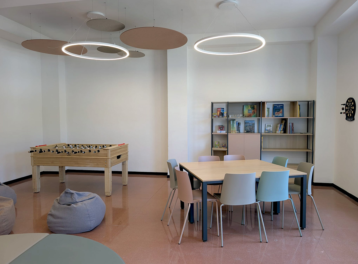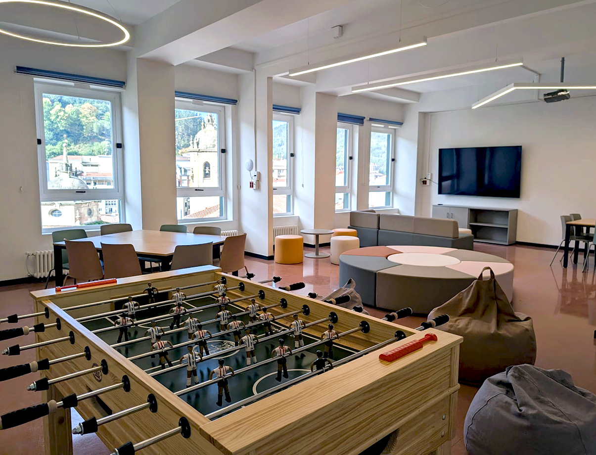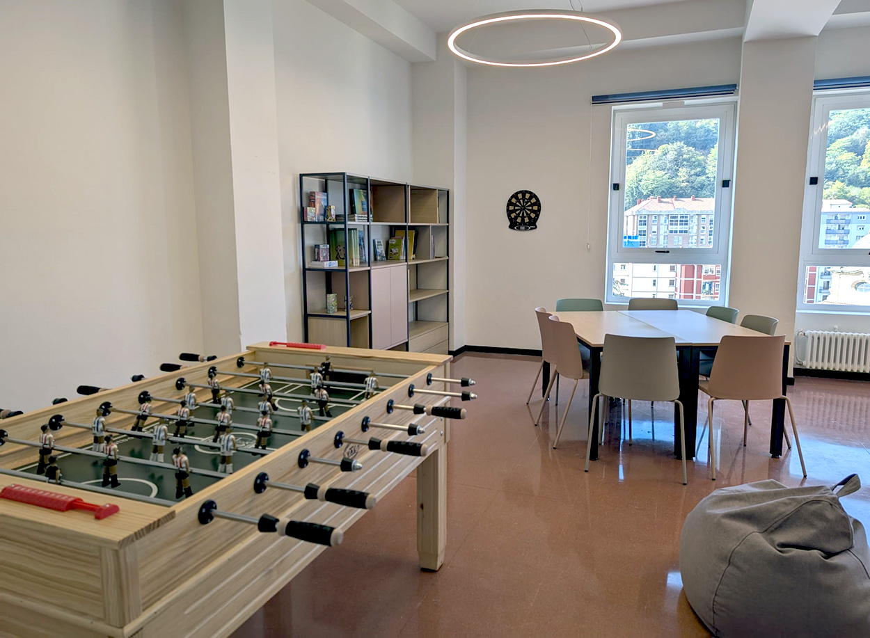 Espazioak hainbat altzairu izango du (mahaiak, besaulkiak, pufak, apalak eta abar), eta jolas- eta aisialdi-elementuak: futbolina, ping ponga, diana eta dardoak, mahai-jokoak, aldizkariak, 86 hazbeteko telebista-pantaila, besteak beste.