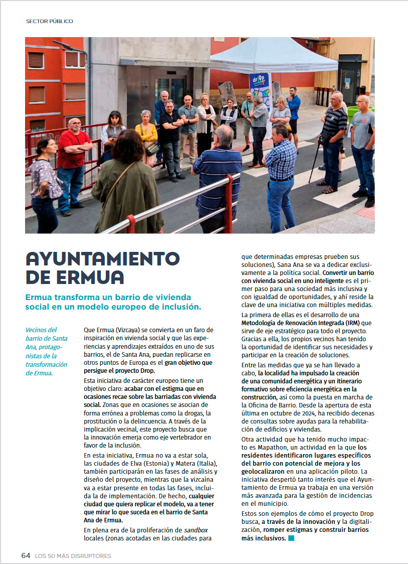 Ermuko Udalak positibotzat jo du 'Los 50 + Disruptores' urtekariak ‘drOp’ europarraren berri eman eta barne hartzea, berrikuntzan eta eraldaketa digitalean joera markatzen ari diren beste ekimen batzuekin batera. Santa Ana auzoan egiten ari diren talde-lana aitortzeko modu bat da, eta tokian tokikotik ere aldaketa garrantzitsuak bultza daitezkeela nabarmentzeko modu bat. Urtekaria doan eskura daiteke helbide honetan: https://k1gvzq1i.sibpages.com/. Ermuko esperientzia 64. orrialdean aipatzen da.
