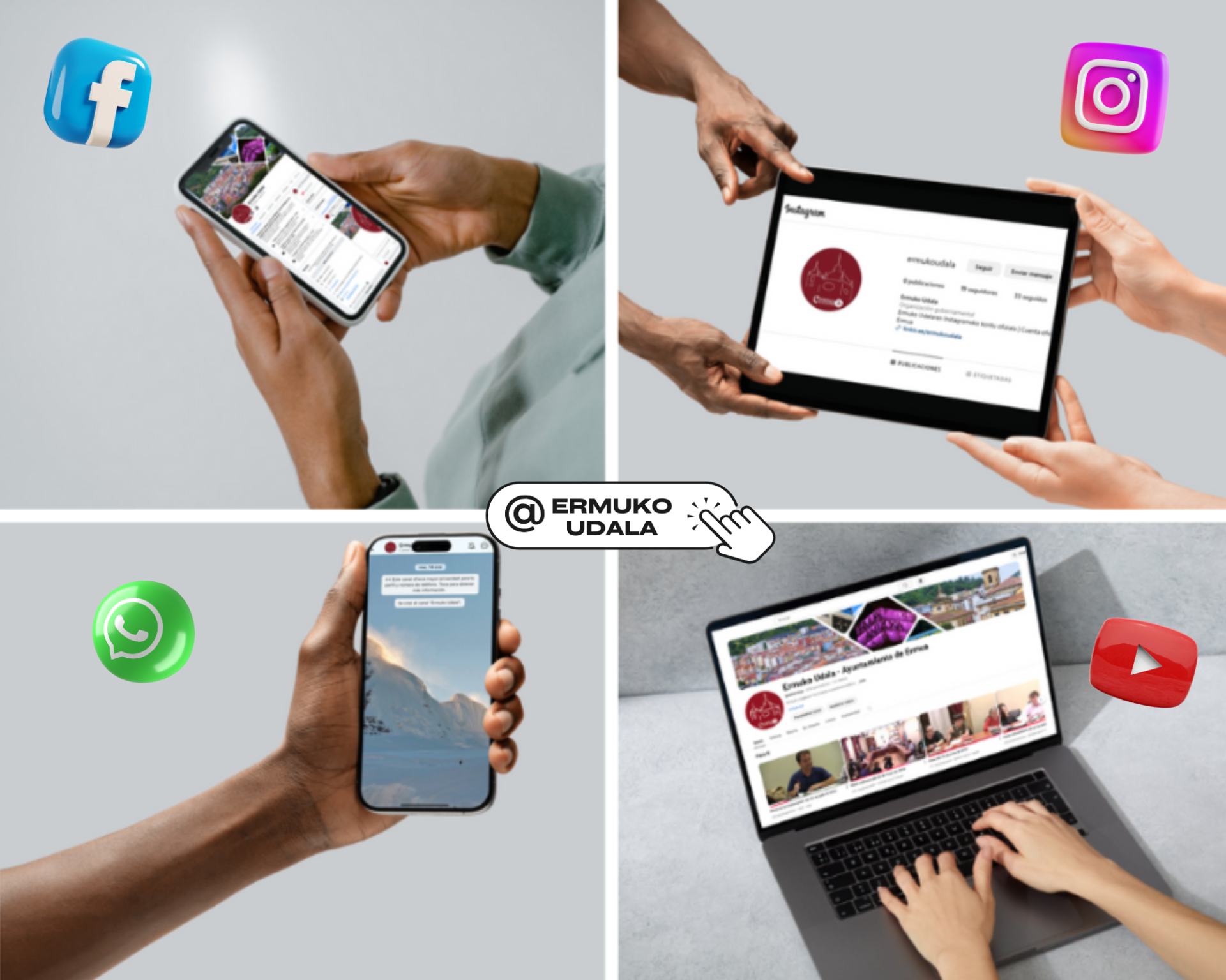 Urte luzez abian egon den YouTubeko kanalaz gain, Ermuak Facebookeko orrialdea, Instagrameko profila eta WhatsAppeko kanala ditu martxan gaurtik aurrera, nahi duen orok kontuak jarraitzeko edo harpidetzeko aukera izan dezan Udalaren azken berriak ezagutzeko. Informazio bide hauen bitartez, udalerrian aurreikusitako hurrengo ekitaldiak, abisuak, oroigarriak eta www.ermua.eus web orrian argitaratutako kultura, kirol, hirigintza edo jarduera instituzionalari buruzko albisteak zabalduko dira. Horrela, interesdunek informazioa zuzenean eta azkar jaso ahal izango dute, udal-webgunean argitaratzen diren albisteen irismena osatuz eta zabalduz eta herritar guztientzat erakargarriak diren eduki berriak eskainiz.