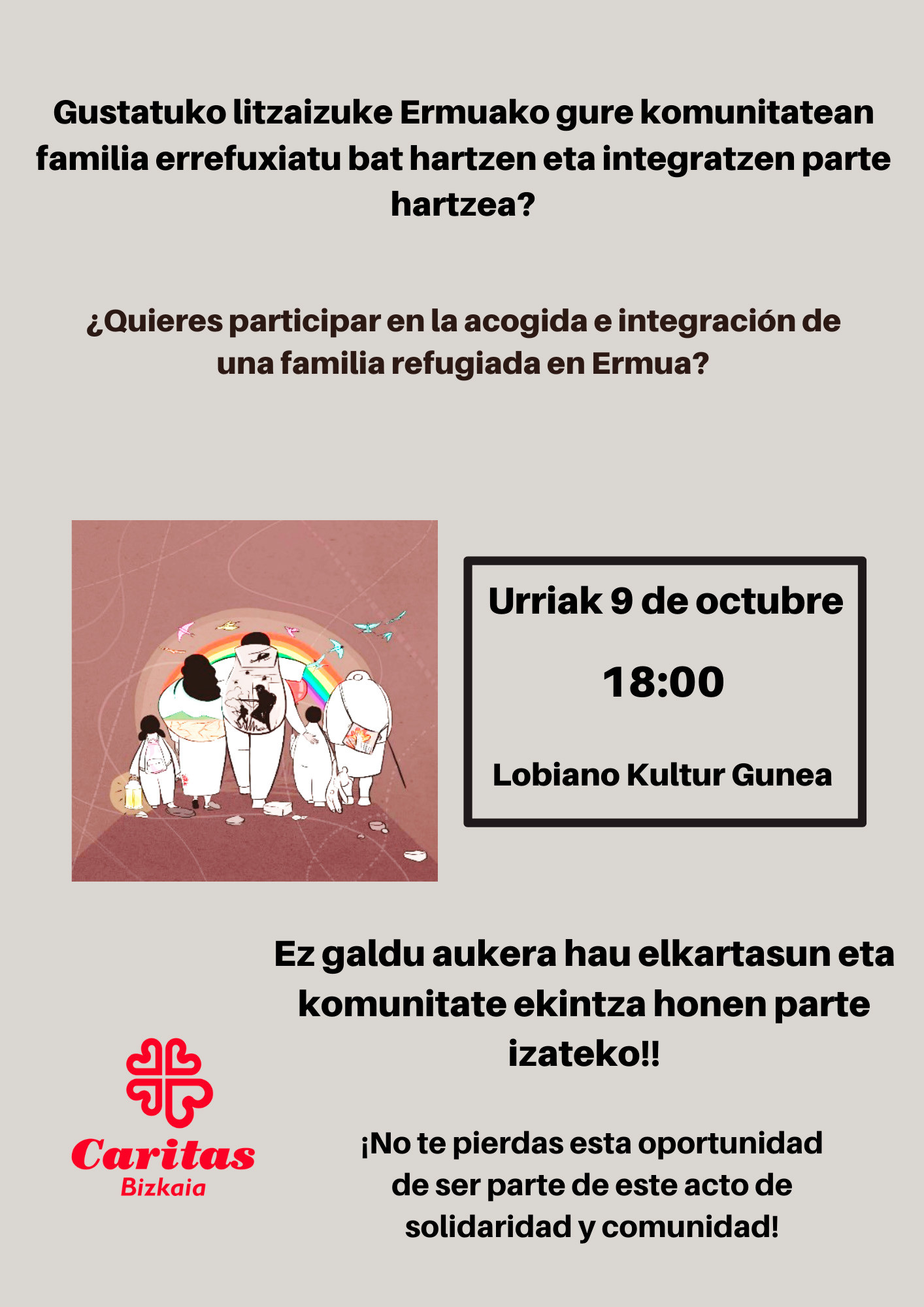 Bizkaiko Caritasek Siriako familia errefuxiatu bat hartuko du Ermuan, Eusko Jaurlaritzaren babes komunitarioko programaren bitartez. Familia horren harrera eta integrazio prozesu horri begira, gure udalaren lankidetzaz gain, Caritasek dei orokorra eta irekia egiten die ermuarrei ekimen honetan parte hartu eta laguntzeko.