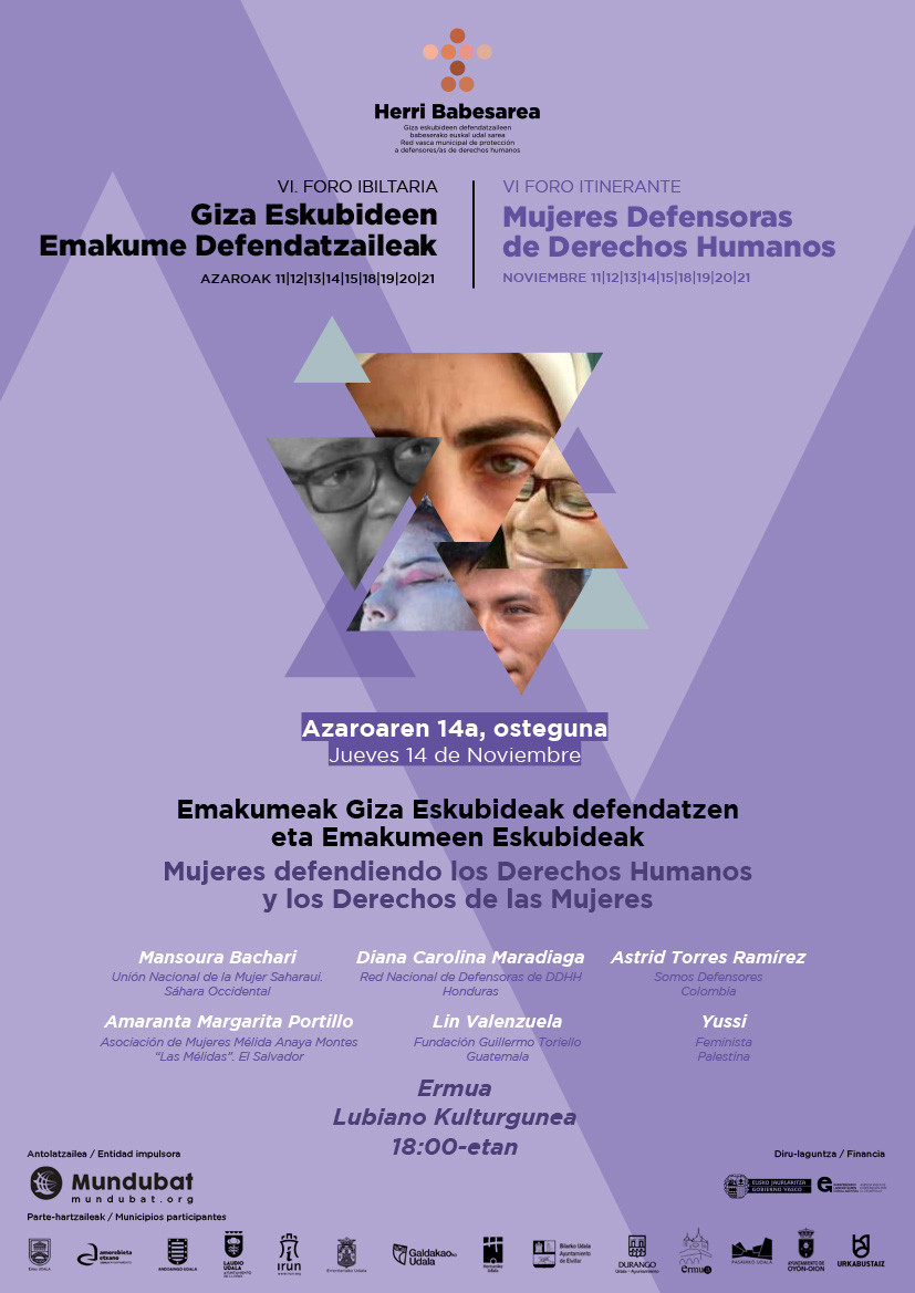 Ermuko saioak ‘Emakumeak Giza Eskubideak eta Emakumeen Eskubideak defendatuz’ izenburua du, eta honako hauek parte hartuko dute: Mansoura Bachari (Saharako Emakumeen Batasun Nazionala), Diana Carolina Maradiaga (Hondurasko Giza Eskubideen Defendatzaileen Sare Nazionala), Astrid Torres Ramírez (Somos Defensores Colombia), Amaranta Margarita Portillo (Mélida Anaya Montes "Las Mélidas" Emakumeen Elkartea, El Salvador), Lin Valenzuela (Guillermo Toriello Fundazioa, Guatemala) eta Yussi (feminista palestinarra).