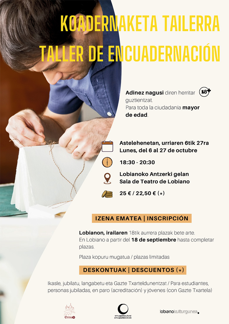Udal Kultura sailak ikastaro berri bat iragarri du; koadernatzeko teknika ikasteko. Interesa duten 18 urtetik gorako guztiei zuzendutako ikastaroa da eta Lobiano Kulturgunean emango da urriko astelehenetan, 18:30etatik 20:30etara bitartean. Gehienez 15 parte-hartzailerentzako lekua dago ikastaroan, horrek 8 ordu iraungo duelarik; bi ordu urriaren 6, 13, 20 eta 27an, astelehenetan.
