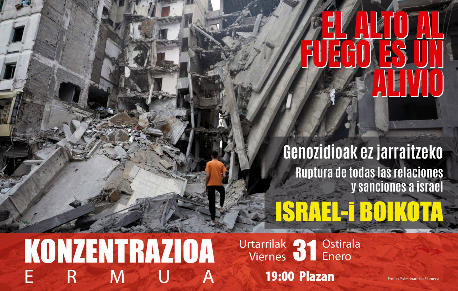 ‘Ermua Palestinarekin’ Ekimenak uste du urtarrilaren 19an indarrean sartu zen su-etena aringarria dela palestinarrentzat, 15 hilabetez etengabe bonbardatu ondoren. Erasoek 47.000 pertsona baino gehiago hil dituzte eta Gazako eskualde osoa erabat suntsituta utzi dute.