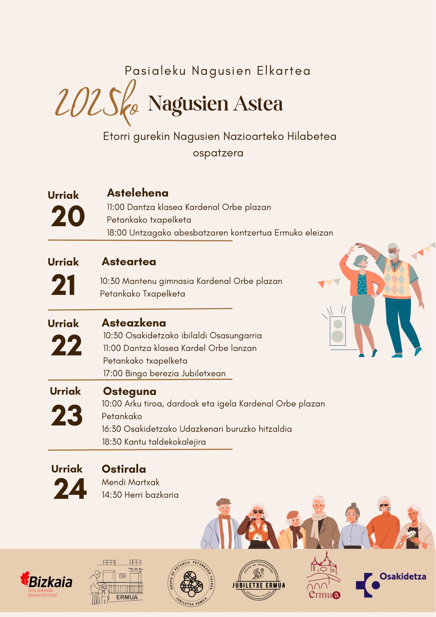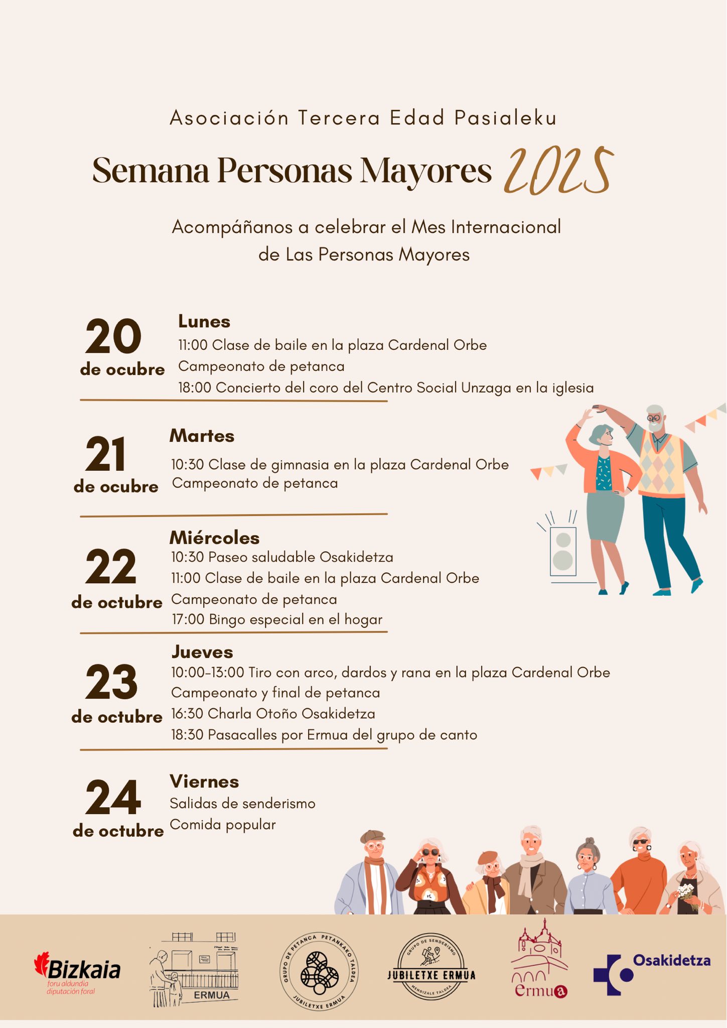Urrian "Adinekoen Nazioarteko Eguna" ospatzen dugu, 1990eko abenduaren 14ko Nazio Batuen Batzar Nagusiaren 45/106 Ebazpenarekin bat etorriz. Ermuan, efemeride honen testuinguruan, hilabete osoan zehar hainbat jarduera gauzatzen ditugu. "Pasialeku" Hirugarren Adinekoen Elkarteak jarduera sorta bat prestatu du datorren asterako, ospakizun hori dela-eta. Jarduera fisikoak, musika, dantza, mendi-ibiliak edo jolas kolektiboak eta herri bazkaria izango da.