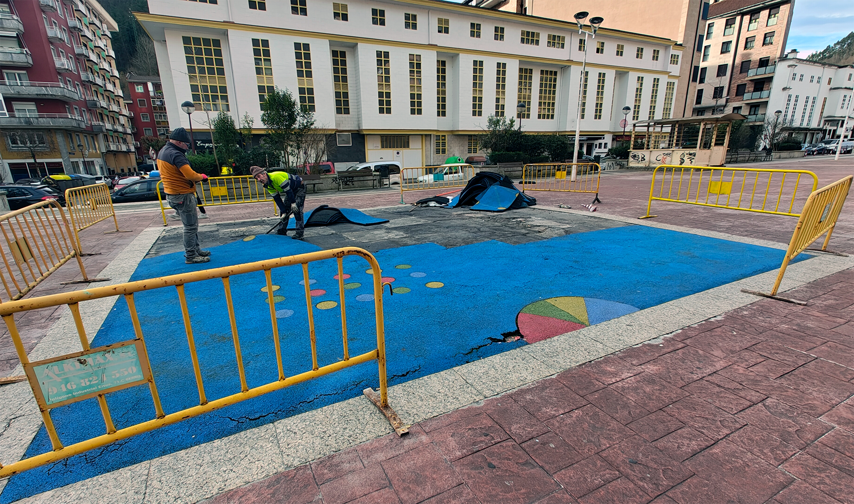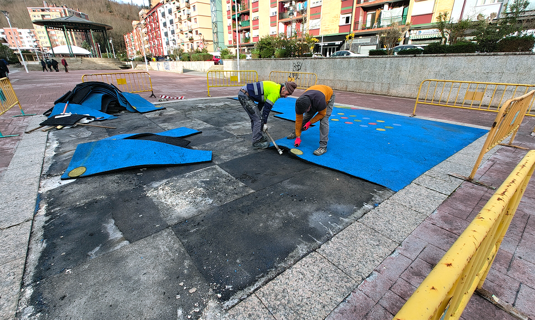 Kautxua kendu, garbitu eta ingurua egokitzeko lanak atzo hasi ziren, segurtasun-perimetroa ezarri eta ingurua seinaleztatu ondoren. Gaur ez da lanik egin, asteko azoka txikiaren jarduera egin behar zelako. Datorren astean hormigoizko zoladura berria egingo da, parkeko erabiltzaileen joan-etorrien segurtasuna bermatzeko.